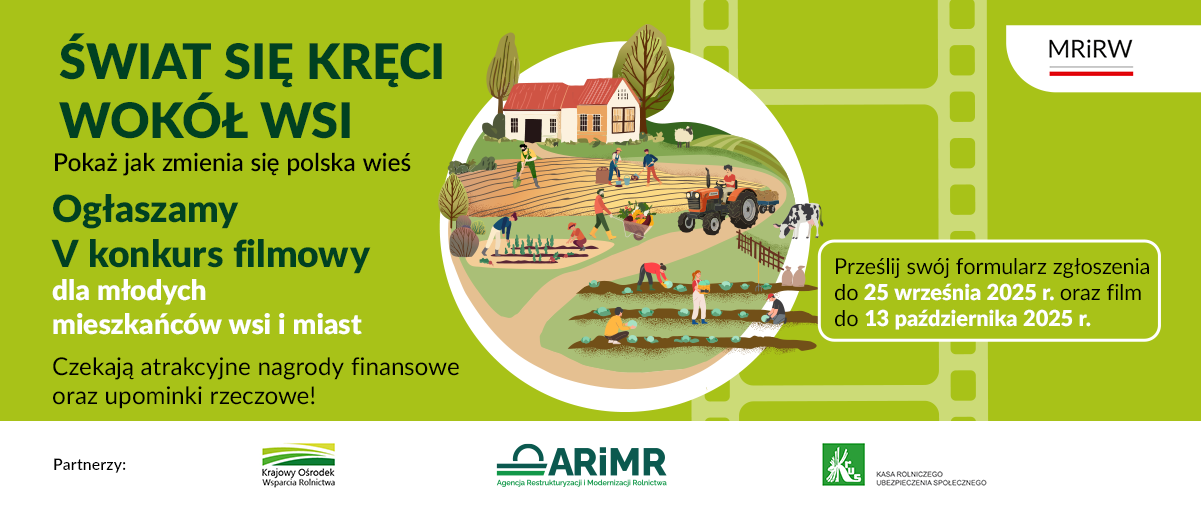 Formularze zgłoszenia przyjmujemy do 25 września 2025 r., a filmy do 13 października 2025 r. Szczegóły znajdziesz na stronie MRiRW oraz na stronach Partnerów: ARiMR, KOWR i KRUS, w zakładkach: www.gov.pl/web/rolnictwo/ogolnopolski-konkurs-filmowy-swiat-sie-kreci-wokol-wsi; https://www.gov.pl/web/arimr/wszystkie-aktualnosci; https://www.gov.pl/web/kowr/aktualnosci; https://www.gov.pl/web/krus.