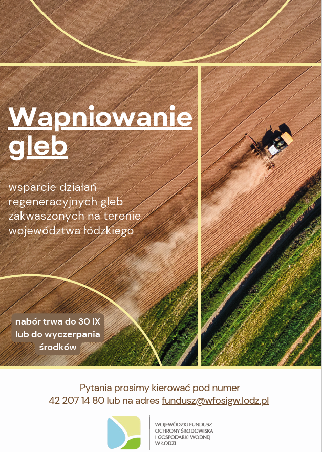 informujemy, że został przedłużony termin naboru wniosków w ramach Programu Priorytetowego WFOŚiGW w Łodzi pn. „Wapnowanie gleb" do 30 września 2025 roku lub do wyczerpania środków.