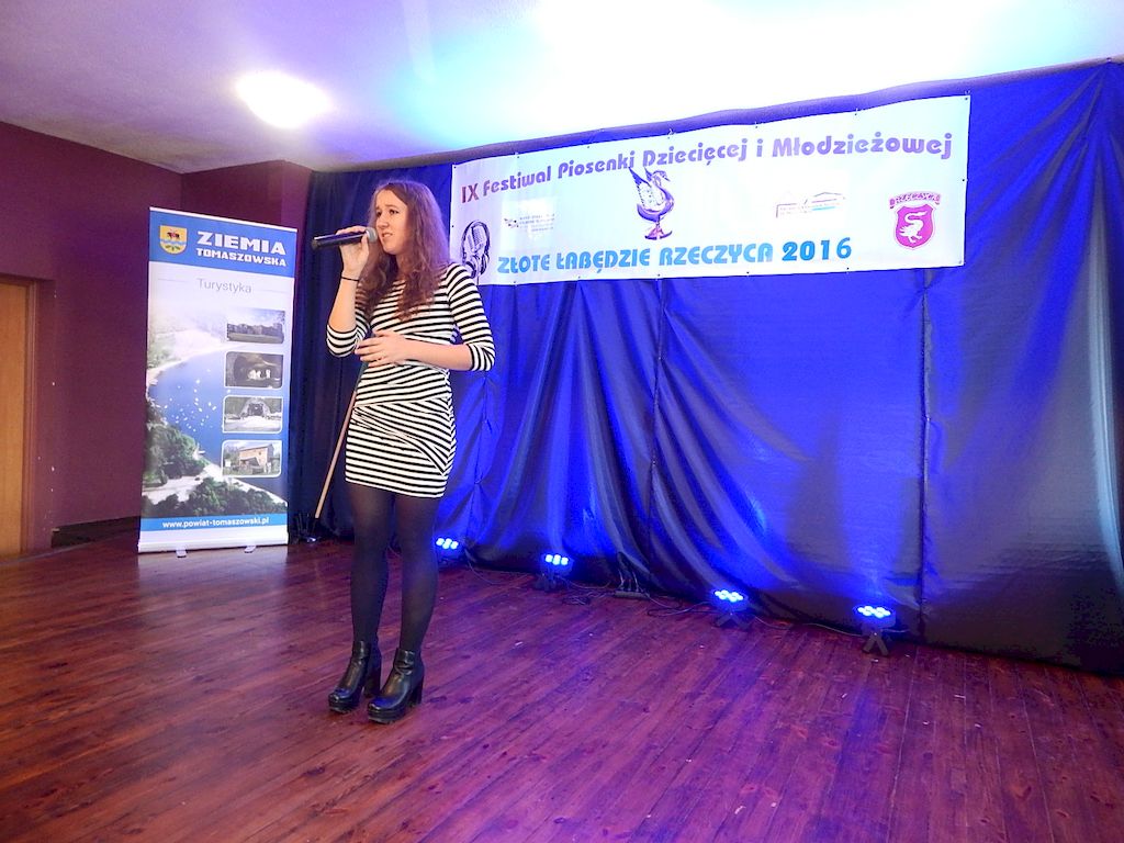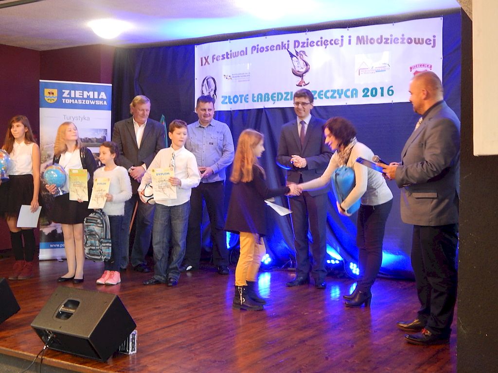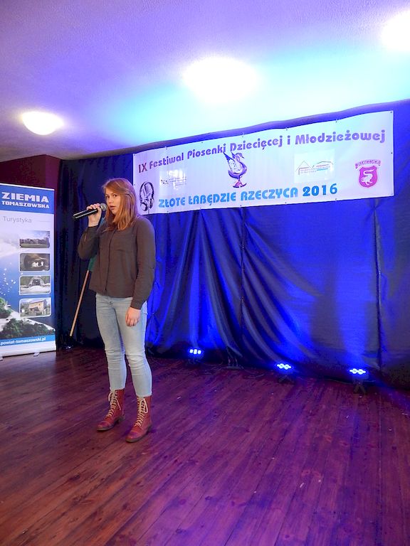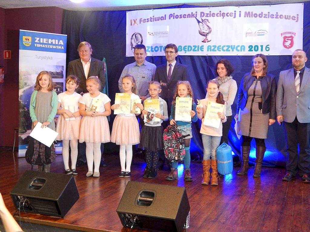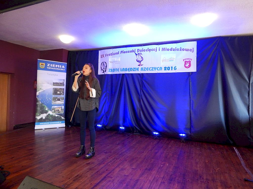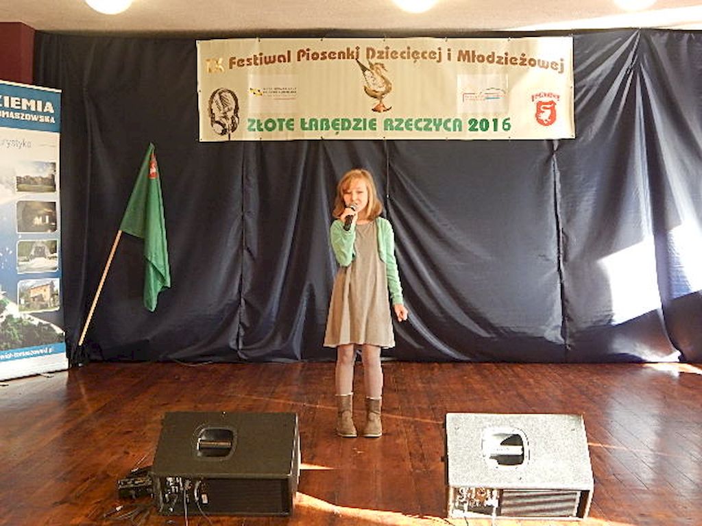 W piątkowy poranek 4 listopada 2016r, Rzeczyca znów stała się stolicą dziecięcej i młodzieżowej piosenki w regionie. Na tegoroczny IX Festiwal Piosenki Dziecięcej i Młodzieżowej Złote Łabędzie Rzeczyca 2016, napłynęły zgłoszenia uczestników z ośmiu powiatów: tomaszowskiego, opoczyńskiego, rawskiego, bełchatowskiego, brzezińskiego, piotrkowskiego, łowickiego oraz grójeckiego. Patronatem Honorowym rzeczyckie święto piosenki objęli Starosta Powiatu Tomaszowskiego Mirosław Kukliński oraz Wójt Gminy Rzeczyca Marek Kaźmierczyk. Impreza odbyła się w ramach Współorganizacji projektów kulturalnych na terenie województwa łódzkiego. Przesłuchania konkursowe miały miejsce w sali widowiskowej Ochotniczej Straży Pożarnej w Rzeczycy. Oficjalnego otwarcia dokonała Zastępca Wójta Gminy Rzeczyca Iwona Łuszcz Krawczyk, życząc młodym wykonawcom udanych prezentacji i zdobycia nowych cennych doświadczeń. Wyraziła również podziękowanie pracownikom GOK-u za coroczne organizowanie Festiwalu. Imprezę prowadzili Dyrektor GOK-u w Rzeczycy Jacek Zakrzewski oraz Karolina Walczyk. Rywalizację o statuetkę Złotego Łabędzia podjęli młodzi wokaliści z Domaniewic k/Łowicza, Drzewicy, Jeżowa, Kleszczowa, Luboczy, Niewiadowa, Opoczna, Rawy Mazowieckiej, Rzeczycy, Sadykierza, Tomaszowa Mazowieckiego oraz Trzepnicy. Przewodniczącą tegorocznego Jury była Marta Markowska z Działu Animacji, Rozwoju i Udostępniania Kultury i Sztuki Łódzkiego Domu Kultury. Wraz z nią oceny uczestników pojęli się Mirosław Murgrabia -muzyk, kapelmistrz, kierownik artystyczny zespołów wokalnych ze Skierniewic oraz Krzysztof Turała- wieloletni nauczyciel śpiewu, kierownik artystyczny wielu zespołów wokalnych i folklorystycznych z Łodzi. Uczestnicy rywalizowali w czterech kategoriach wiekowych prezentując po jednym utworze. Prezentowany repertuar był bardzo zróżnicowany, od piosenki popularnej poprzez piosenkę poetycką po nowatorskie aranżacje utworów folkowych. Komisja podkreślała podnoszący się z roku na rok poziom wykonywanych utworów. Nowością tegorocznego Festiwalu były warsztaty „Praca z mikrofonem", które przeprowadził wokalista a zarazem akustyk z dużym doświadczeniem scenicznym Michał Kołodziejski z Kielc. GRAND PRIX Festiwalu –statuetkę Złotego Łabędzia wyśpiewała Agata Siedlecka z Miejskiego Domu Kultury w Opocznie. Rywalizowała w kategorii klas 0-III szkoły podstawowej. Jej instruktorem jest Izabela Czapla a zaśpiewała piosenkę pod tytułem „Róża i jeż" Jarosława Piątkowskiego do słów Elżbiety Buczyńskiej. W kategorii szkoły podstawowe klasy 0-III zwyciężyła Gabriela Wasiak z Rzeczycy, w kategorii szkoły podstawowe klasy IV-VI laureatką pierwszej nagrody została Zuzanna Walkiewicz z Opoczna. W kategoriach starszych jury pierwsze miejsce przyznało Mai Korzeniowskiej z Niewiadowa – gimnazjum oraz Marcie Łyda z Opoczna – kategoria młodzież szkół średnich. Podczas obrad Jury swoje umiejętności zaprezentowały Zespoły Taneczne działające w GOK-u w Rzeczycy: Zespół Migotki, Zespół Wybryk oraz Zespół Twist. Ich prezentacje przygotowane przez instruktorkę Karolinę Walczyk zostały nagrodzone gromkimi brawami. Wręczając ufundowane statuetki Złotego Łabędzia, laureatom gratulował Wójt Gminy Rzeczyca Marek Kaźmierczyk, podkreślając możliwość zdobycia doświadczenia na deskach rzeczyckiej sceny. Dyplomy i nagrody rzeczowe wręczali Jacek Zakrzewski Dyrektor GOK-u w Rzeczycy oraz Marta Markowska z Łódzkiego Domu Kultury. Nagrody ufundowali: Gmina Rzeczyca oraz Powiat Tomaszowski. Ponadto Festiwal uzyskał dofinansowanie z Łódzkiego Domu Kultury. Lista laureatów Festiwalu Złote Łabędzie Rzeczyca 2016 Kategoria wiekowa szkoły podstawowe klasy 0-III
