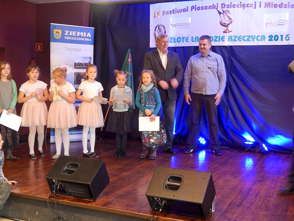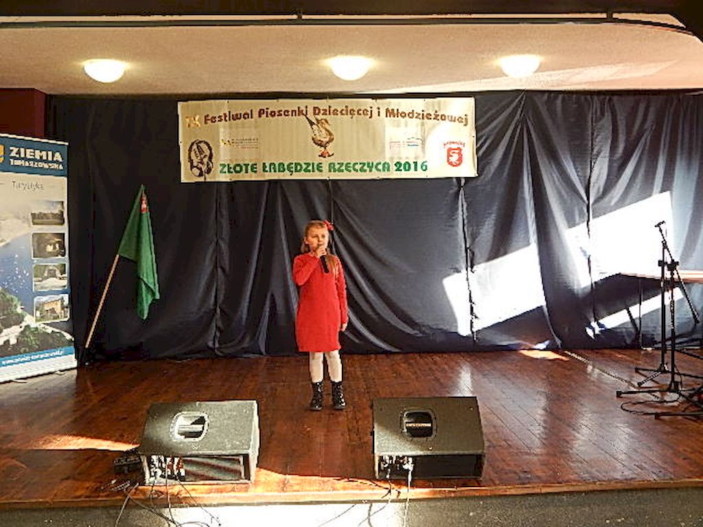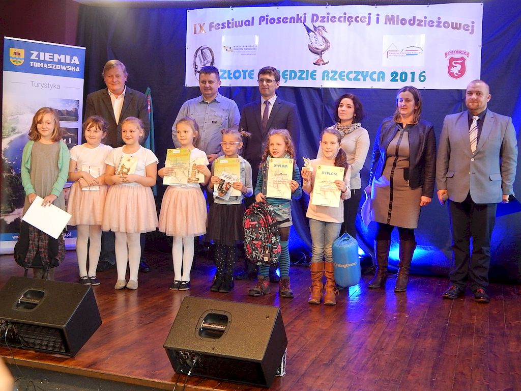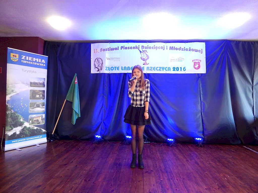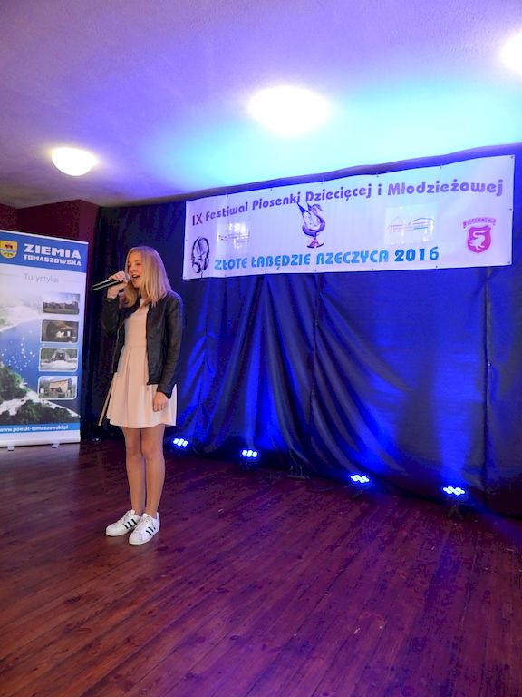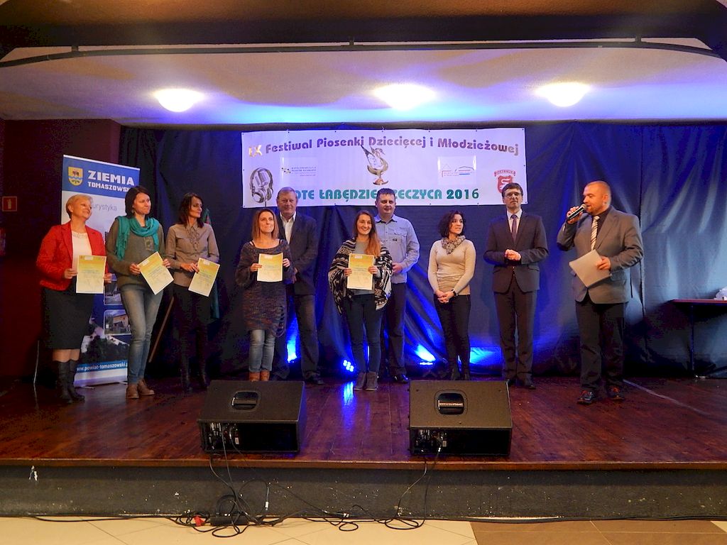 W piątkowy poranek 4 listopada 2016r, Rzeczyca znów stała się stolicą dziecięcej i młodzieżowej piosenki w regionie. Na tegoroczny IX Festiwal Piosenki Dziecięcej i Młodzieżowej Złote Łabędzie Rzeczyca 2016, napłynęły zgłoszenia uczestników z ośmiu powiatów: tomaszowskiego, opoczyńskiego, rawskiego, bełchatowskiego, brzezińskiego, piotrkowskiego, łowickiego oraz grójeckiego. Patronatem Honorowym rzeczyckie święto piosenki objęli Starosta Powiatu Tomaszowskiego Mirosław Kukliński oraz Wójt Gminy Rzeczyca Marek Kaźmierczyk. Impreza odbyła się w ramach Współorganizacji projektów kulturalnych na terenie województwa łódzkiego. Przesłuchania konkursowe miały miejsce w sali widowiskowej Ochotniczej Straży Pożarnej w Rzeczycy. Oficjalnego otwarcia dokonała Zastępca Wójta Gminy Rzeczyca Iwona Łuszcz Krawczyk, życząc młodym wykonawcom udanych prezentacji i zdobycia nowych cennych doświadczeń. Wyraziła również podziękowanie pracownikom GOK-u za coroczne organizowanie Festiwalu. Imprezę prowadzili Dyrektor GOK-u w Rzeczycy Jacek Zakrzewski oraz Karolina Walczyk. Rywalizację o statuetkę Złotego Łabędzia podjęli młodzi wokaliści z Domaniewic k/Łowicza, Drzewicy, Jeżowa, Kleszczowa, Luboczy, Niewiadowa, Opoczna, Rawy Mazowieckiej, Rzeczycy, Sadykierza, Tomaszowa Mazowieckiego oraz Trzepnicy. Przewodniczącą tegorocznego Jury była Marta Markowska z Działu Animacji, Rozwoju i Udostępniania Kultury i Sztuki Łódzkiego Domu Kultury. Wraz z nią oceny uczestników pojęli się Mirosław Murgrabia -muzyk, kapelmistrz, kierownik artystyczny zespołów wokalnych ze Skierniewic oraz Krzysztof Turała- wieloletni nauczyciel śpiewu, kierownik artystyczny wielu zespołów wokalnych i folklorystycznych z Łodzi. Uczestnicy rywalizowali w czterech kategoriach wiekowych prezentując po jednym utworze. Prezentowany repertuar był bardzo zróżnicowany, od piosenki popularnej poprzez piosenkę poetycką po nowatorskie aranżacje utworów folkowych. Komisja podkreślała podnoszący się z roku na rok poziom wykonywanych utworów. Nowością tegorocznego Festiwalu były warsztaty „Praca z mikrofonem", które przeprowadził wokalista a zarazem akustyk z dużym doświadczeniem scenicznym Michał Kołodziejski z Kielc. GRAND PRIX Festiwalu –statuetkę Złotego Łabędzia wyśpiewała Agata Siedlecka z Miejskiego Domu Kultury w Opocznie. Rywalizowała w kategorii klas 0-III szkoły podstawowej. Jej instruktorem jest Izabela Czapla a zaśpiewała piosenkę pod tytułem „Róża i jeż" Jarosława Piątkowskiego do słów Elżbiety Buczyńskiej. W kategorii szkoły podstawowe klasy 0-III zwyciężyła Gabriela Wasiak z Rzeczycy, w kategorii szkoły podstawowe klasy IV-VI laureatką pierwszej nagrody została Zuzanna Walkiewicz z Opoczna. W kategoriach starszych jury pierwsze miejsce przyznało Mai Korzeniowskiej z Niewiadowa – gimnazjum oraz Marcie Łyda z Opoczna – kategoria młodzież szkół średnich. Podczas obrad Jury swoje umiejętności zaprezentowały Zespoły Taneczne działające w GOK-u w Rzeczycy: Zespół Migotki, Zespół Wybryk oraz Zespół Twist. Ich prezentacje przygotowane przez instruktorkę Karolinę Walczyk zostały nagrodzone gromkimi brawami. Wręczając ufundowane statuetki Złotego Łabędzia, laureatom gratulował Wójt Gminy Rzeczyca Marek Kaźmierczyk, podkreślając możliwość zdobycia doświadczenia na deskach rzeczyckiej sceny. Dyplomy i nagrody rzeczowe wręczali Jacek Zakrzewski Dyrektor GOK-u w Rzeczycy oraz Marta Markowska z Łódzkiego Domu Kultury. Nagrody ufundowali: Gmina Rzeczyca oraz Powiat Tomaszowski. Ponadto Festiwal uzyskał dofinansowanie z Łódzkiego Domu Kultury. Lista laureatów Festiwalu Złote Łabędzie Rzeczyca 2016 Kategoria wiekowa szkoły podstawowe klasy 0-III