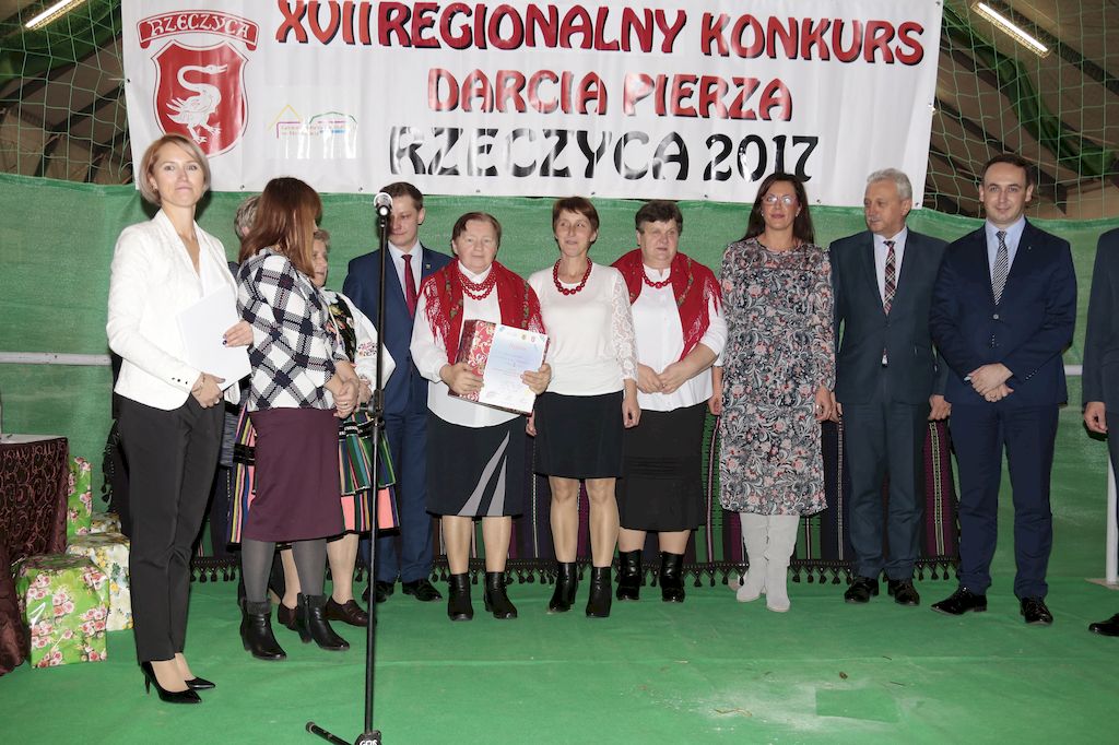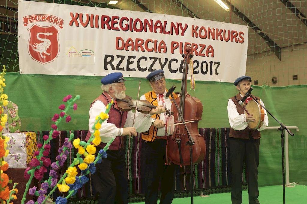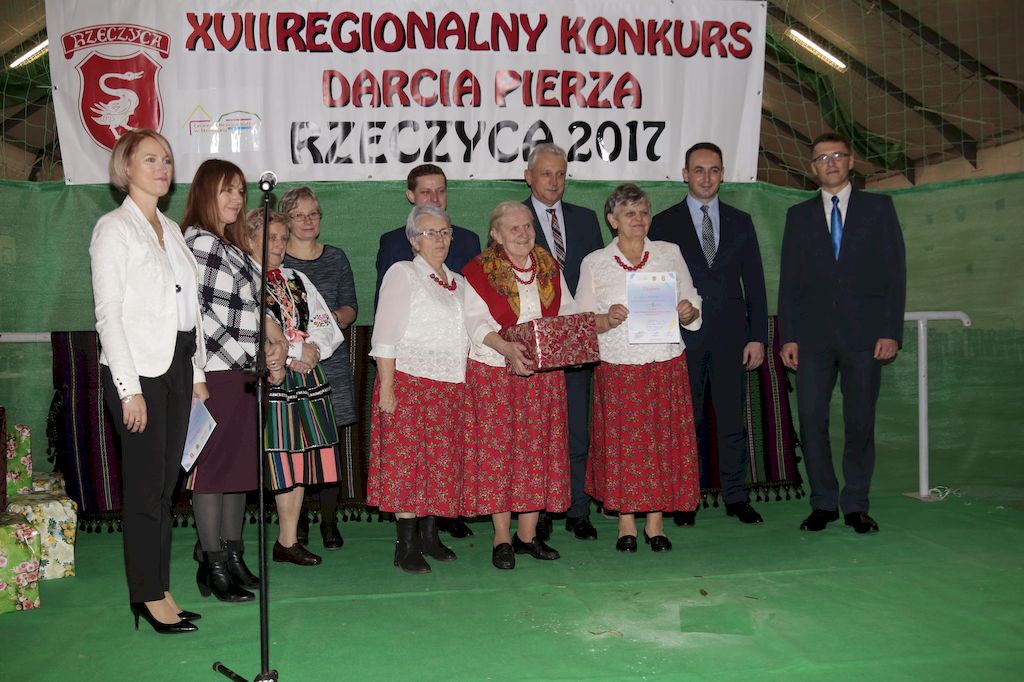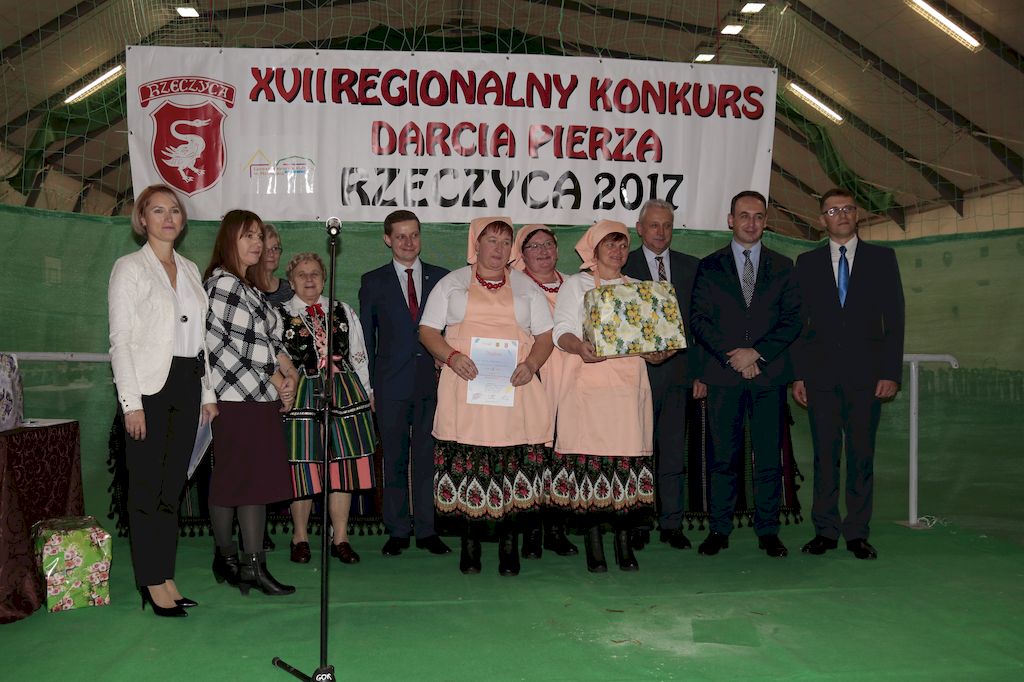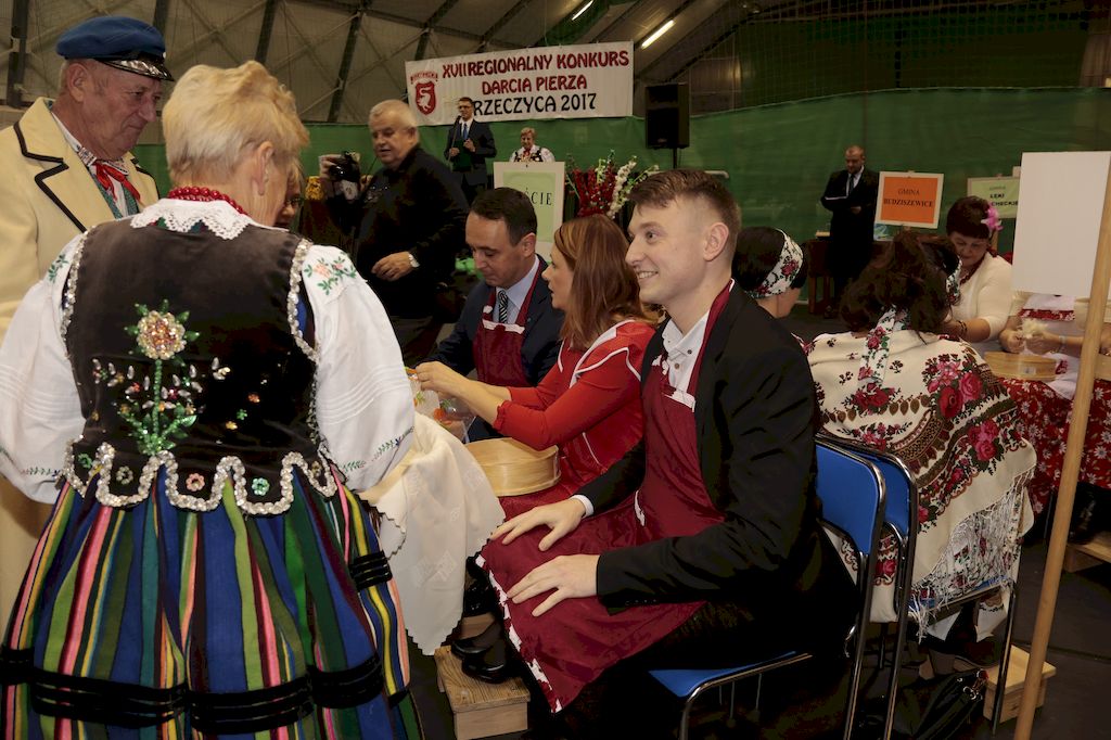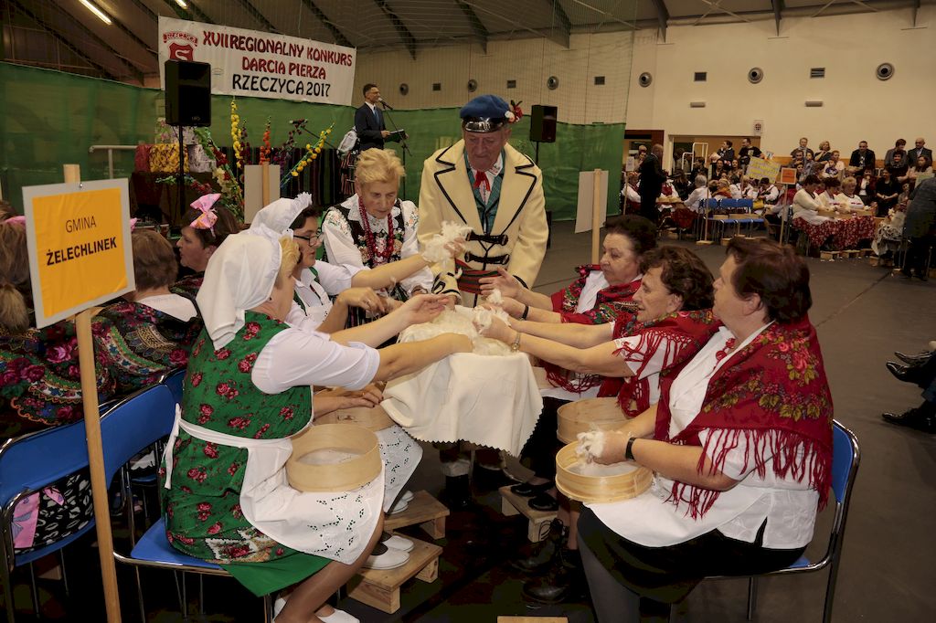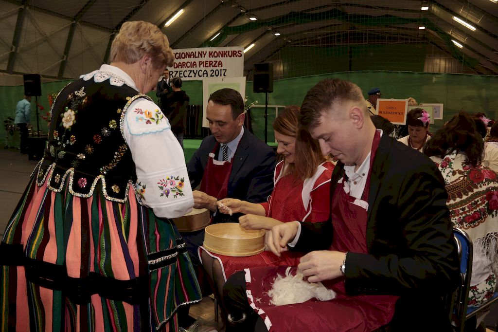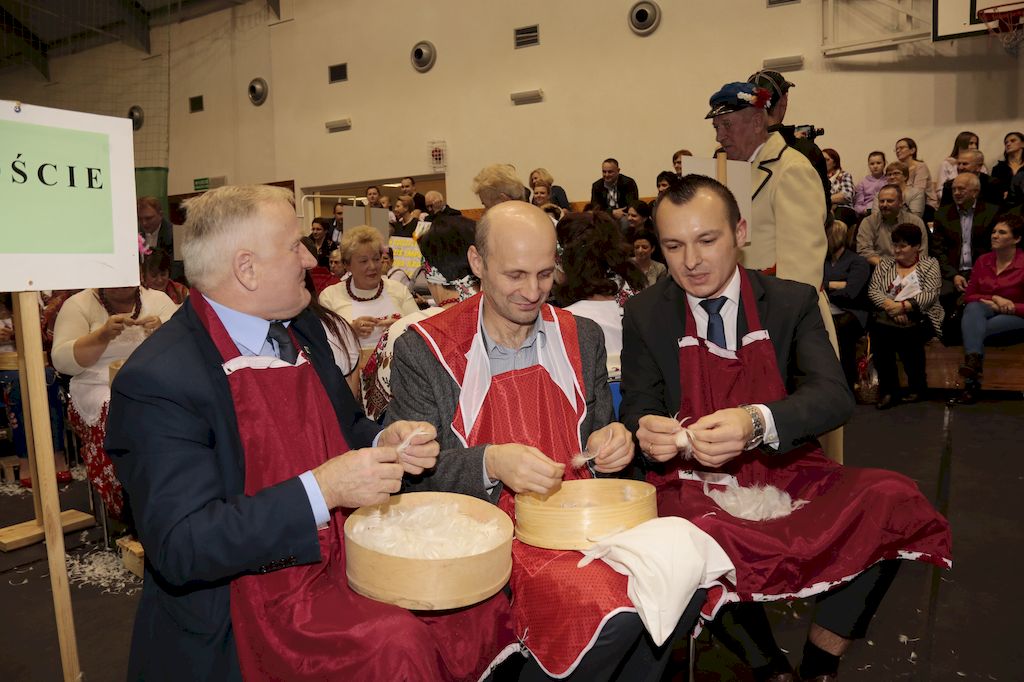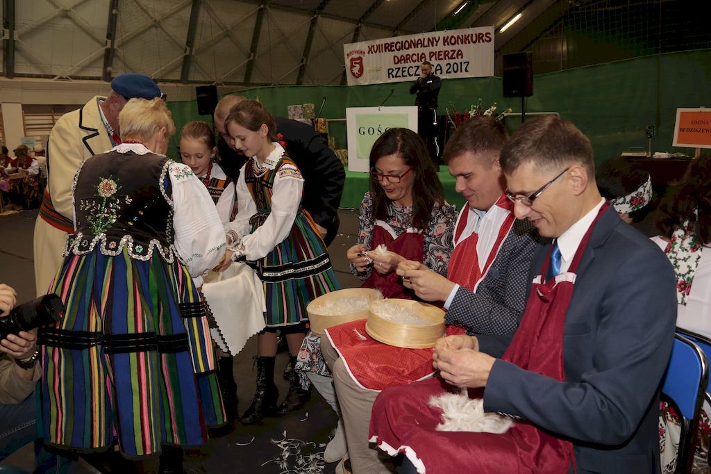 Tradycyjnie uczestników i gości naszej Pierzawki przywitała muzyka ludowa w wykonaniu Kapeli Gmajów. Konkurs otworzył oraz gości powitał Wójt Marek Kaźmierczyk. Komisję konkursową w składzie: Iwona Łuszcz Krawczyk Zastępca Wójta Gminy - Przewodnicząca, Bartłomiej Matysiak Członek Zarządu Powiatu Tomaszowskiego, Beata Ozga Flejszer Radna Sejmiku Województwa Łódzkiego, Marianna Pawlak twórczyni ludowa oraz Grażyna Kamińska z GOKu w Rzeczycy, przedstawił prowadzący imprezę, Dyrektor GOK-u Jacek Zakrzewski. Po ocenie jakości i wagi pierza zdartego podczas półtoragodzinnej rywalizacji, komisja najlepiej oceniła pracę reprezentacji Gminy Budziszewice i pierwsze miejsce przyznała drużynie Stowarzyszenia Kobiet Mierznianki z Mierzna. W konkursie rywalizowały drużyny: KGW z Nowin z gminy Bedków, KGW Wale z Gminy Czerniewice, KGW Brzustów z Gminy Inowłódz, KGW z Kochanowa z Gminy Lubochnia, KGW z Wąwału z Gminy Tomaszów Maz, KGW z Olszowej z Gminy Ujazd, KGW z Michałowa z Gminy Rokiciny, KGW z Bukowca z Gminy Żelechlinek, KGW z Wąglan z Gminy Białaczów, drużyna połączonych zespołów śpiewaczych: Bukowianki, Leśnianka oraz Stefanów z Gminy Brójce, KGW z Łęk Szlacheckich oraz KGW z Buczku z Gminy Poświętne. Gospodarzy- Gminę Rzeczyca reprezentowały Panie z KGW Glina Teresa Gmaj, Jadwiga Sobolewska oraz Bożena Dębicka. Po raz pierwszy Wójt Gminy Marek Kaźmierczyk zaprosił do darcia na specjalnie przygotowanym stanowisku gości naszej Pierzawki. Tej, okazuje się niełatwej sztuki próbowali miedzy innymi Marszałek Województwa Łódzkiego Dariusz Klimczak, starostowie, radni, wójtowie, przedstawiciele urzędów i zaprzyjaźnionych instytucji. Podczas darcia pierza widzowie mieli okazję zobaczyć występy Kapeli Gmajów, Kapeli Bobrowianie, Zespołu Ludowego Mali Rzeczycanie, Radosnej Grupy Folkowej Śliczny Zespół, posłuchać wywiadu z drużynami przeprowadzonego przez Kabaret Wcięci Przypadkiem oraz zobaczyć skecz w wykonaniu KGW z Wąglan. Tradycyjnie ze zdartego pierza wykonana zostanie poducha którą Wójt Gminy obdaruje pierwszego narodzonego w 2018 roku mieszkańca naszej gminy. Po wręczeniu nagród praz gospodarzy imprezy Starostę Mirosława Kuklińskiego oraz Wójta Marka Kaźmierczyka, Przewodniczącą Komisji Iwonę Łuszcz Krawczyk w towarzystwie Marszałka Dariusza Klimczaka, goście oraz mieszkańcy zostali zaproszeni na poczęstunek. Do późnych godzin nocnych uczestników bawił zespół Qattro z Inowłodza.