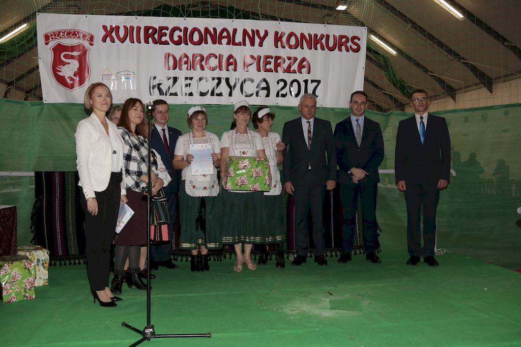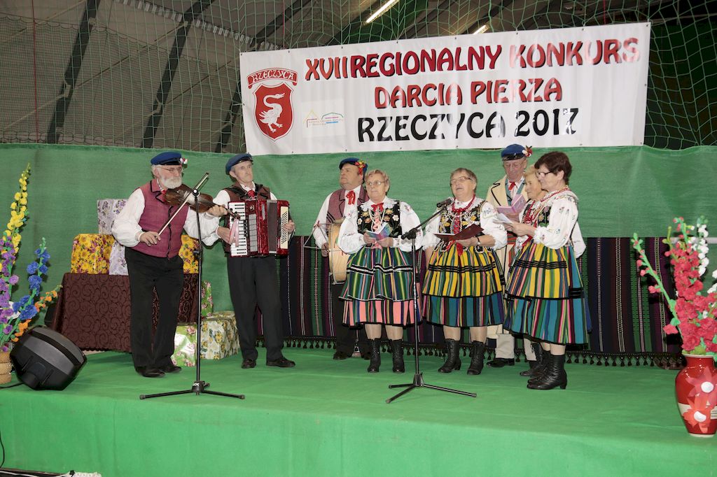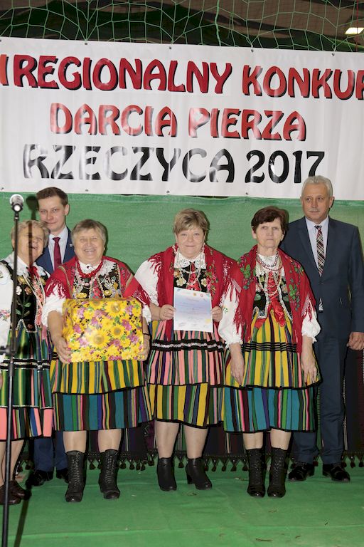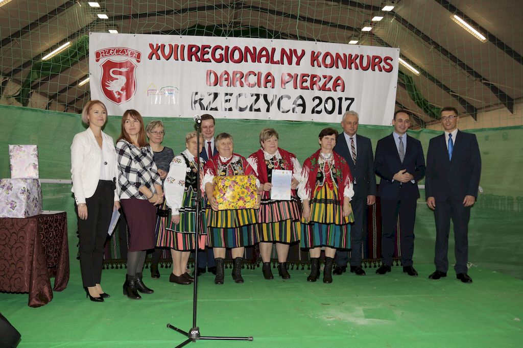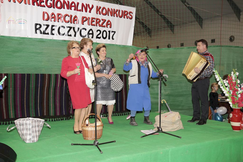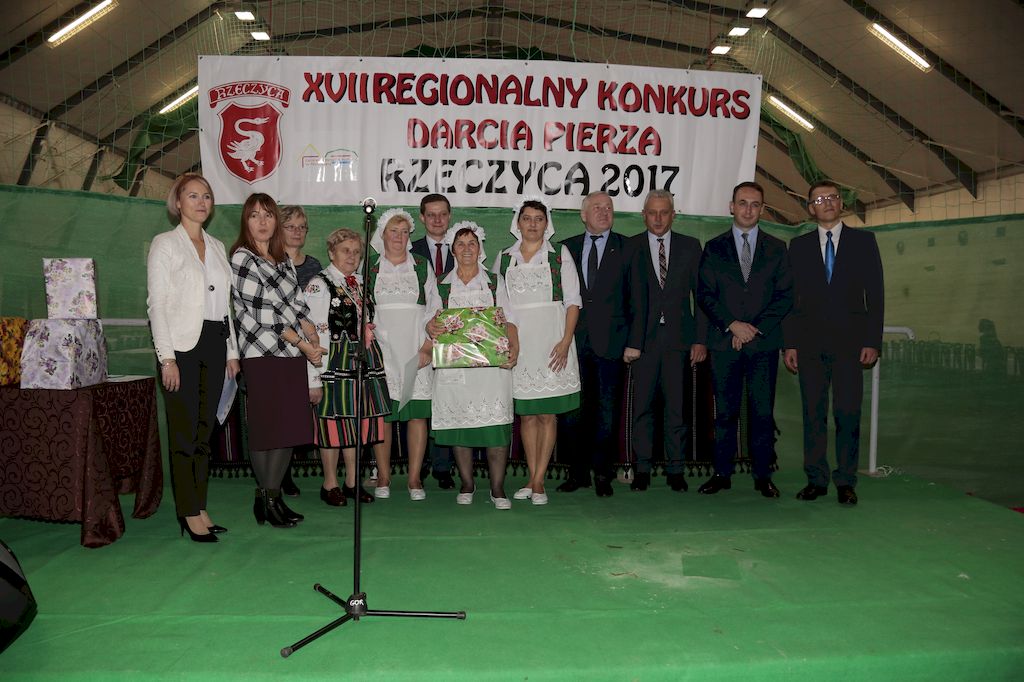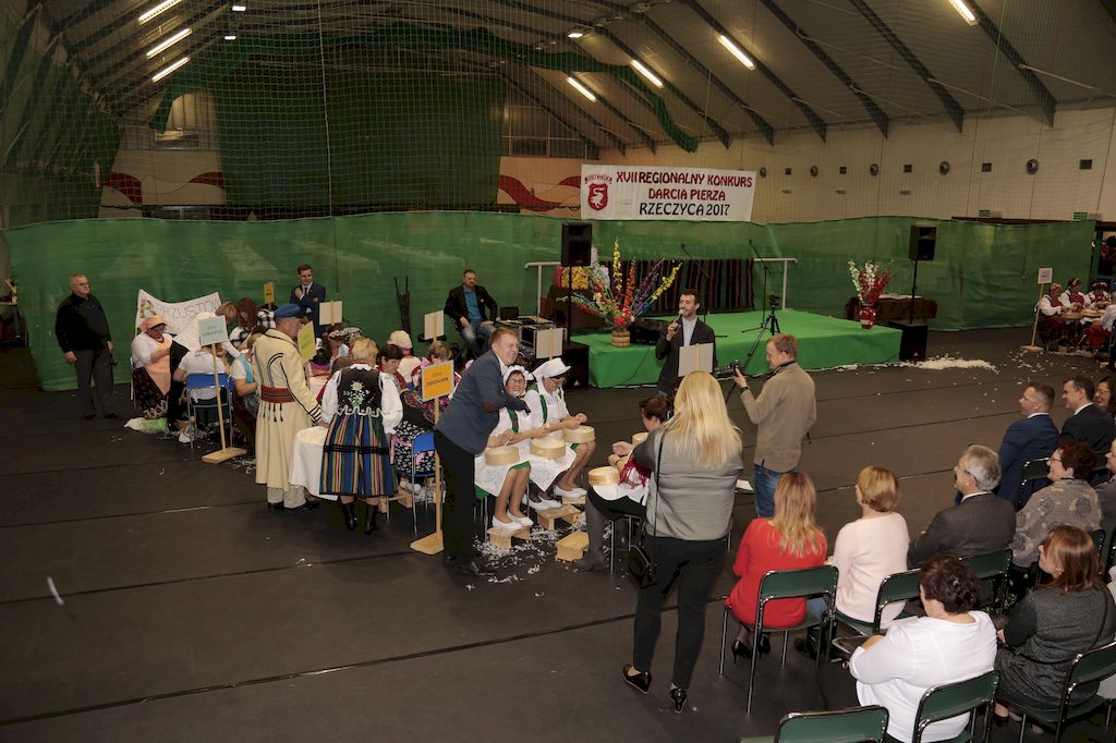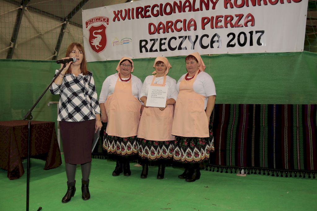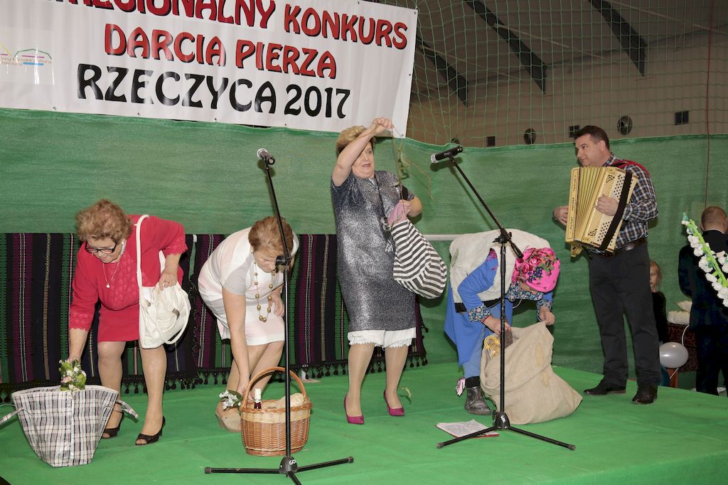 Tradycyjnie uczestników i gości naszej Pierzawki przywitała muzyka ludowa w wykonaniu Kapeli Gmajów. Konkurs otworzył oraz gości powitał Wójt Marek Kaźmierczyk. Komisję konkursową w składzie: Iwona Łuszcz Krawczyk Zastępca Wójta Gminy - Przewodnicząca, Bartłomiej Matysiak Członek Zarządu Powiatu Tomaszowskiego, Beata Ozga Flejszer Radna Sejmiku Województwa Łódzkiego, Marianna Pawlak twórczyni ludowa oraz Grażyna Kamińska z GOKu w Rzeczycy, przedstawił prowadzący imprezę, Dyrektor GOK-u Jacek Zakrzewski. Po ocenie jakości i wagi pierza zdartego podczas półtoragodzinnej rywalizacji, komisja najlepiej oceniła pracę reprezentacji Gminy Budziszewice i pierwsze miejsce przyznała drużynie Stowarzyszenia Kobiet Mierznianki z Mierzna. W konkursie rywalizowały drużyny: KGW z Nowin z gminy Bedków, KGW Wale z Gminy Czerniewice, KGW Brzustów z Gminy Inowłódz, KGW z Kochanowa z Gminy Lubochnia, KGW z Wąwału z Gminy Tomaszów Maz, KGW z Olszowej z Gminy Ujazd, KGW z Michałowa z Gminy Rokiciny, KGW z Bukowca z Gminy Żelechlinek, KGW z Wąglan z Gminy Białaczów, drużyna połączonych zespołów śpiewaczych: Bukowianki, Leśnianka oraz Stefanów z Gminy Brójce, KGW z Łęk Szlacheckich oraz KGW z Buczku z Gminy Poświętne. Gospodarzy- Gminę Rzeczyca reprezentowały Panie z KGW Glina Teresa Gmaj, Jadwiga Sobolewska oraz Bożena Dębicka. Po raz pierwszy Wójt Gminy Marek Kaźmierczyk zaprosił do darcia na specjalnie przygotowanym stanowisku gości naszej Pierzawki. Tej, okazuje się niełatwej sztuki próbowali miedzy innymi Marszałek Województwa Łódzkiego Dariusz Klimczak, starostowie, radni, wójtowie, przedstawiciele urzędów i zaprzyjaźnionych instytucji. Podczas darcia pierza widzowie mieli okazję zobaczyć występy Kapeli Gmajów, Kapeli Bobrowianie, Zespołu Ludowego Mali Rzeczycanie, Radosnej Grupy Folkowej Śliczny Zespół, posłuchać wywiadu z drużynami przeprowadzonego przez Kabaret Wcięci Przypadkiem oraz zobaczyć skecz w wykonaniu KGW z Wąglan. Tradycyjnie ze zdartego pierza wykonana zostanie poducha którą Wójt Gminy obdaruje pierwszego narodzonego w 2018 roku mieszkańca naszej gminy. Po wręczeniu nagród praz gospodarzy imprezy Starostę Mirosława Kuklińskiego oraz Wójta Marka Kaźmierczyka, Przewodniczącą Komisji Iwonę Łuszcz Krawczyk w towarzystwie Marszałka Dariusza Klimczaka, goście oraz mieszkańcy zostali zaproszeni na poczęstunek. Do późnych godzin nocnych uczestników bawił zespół Qattro z Inowłodza.