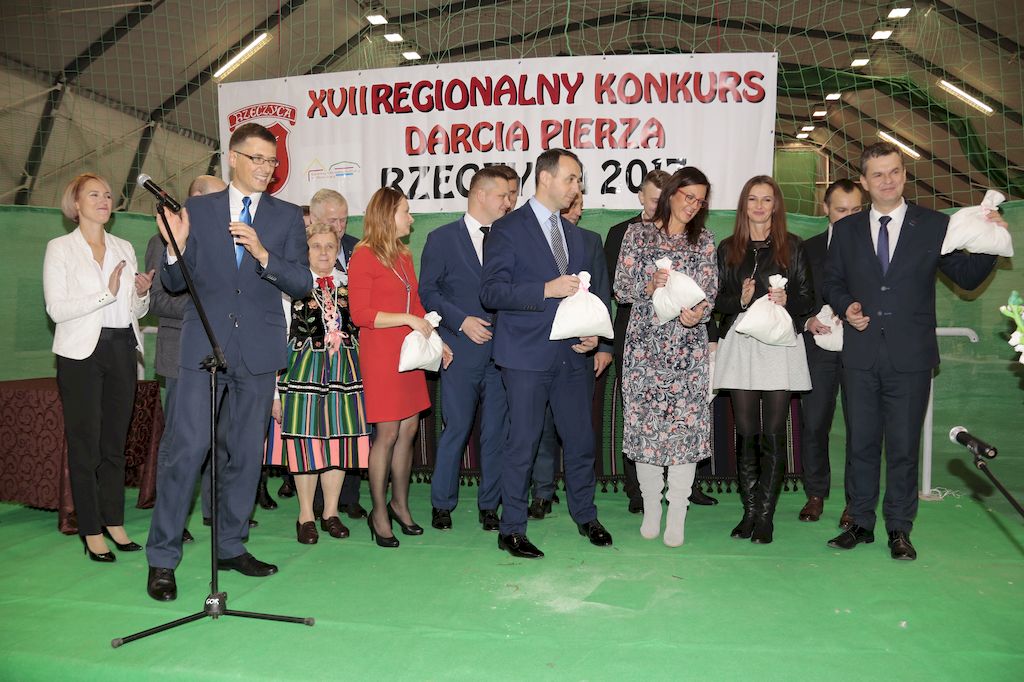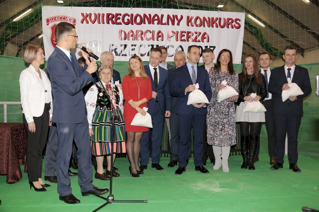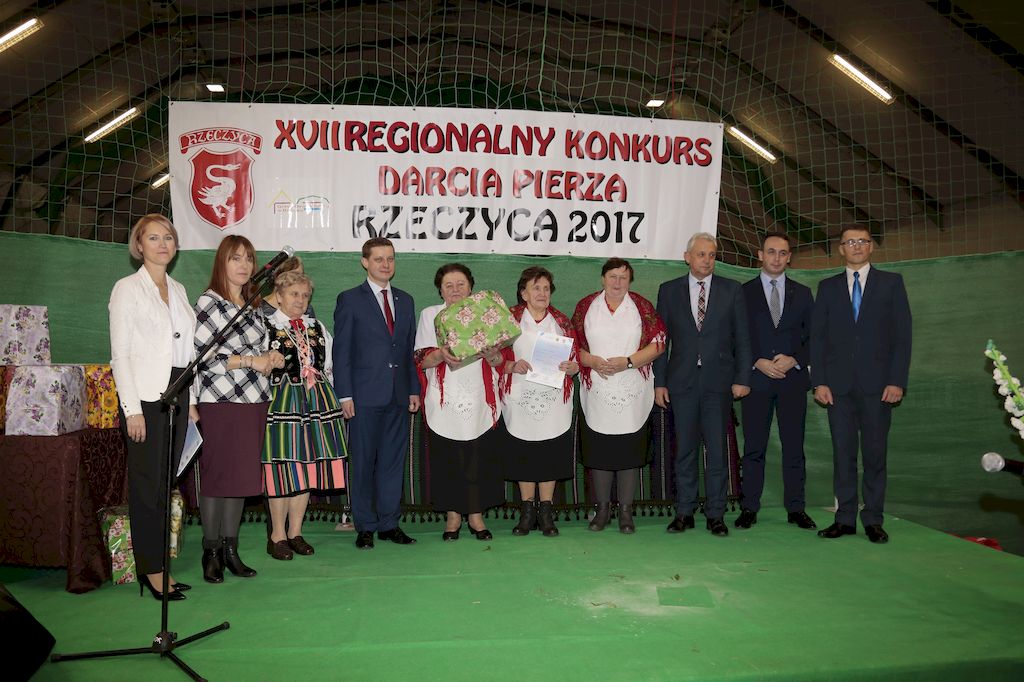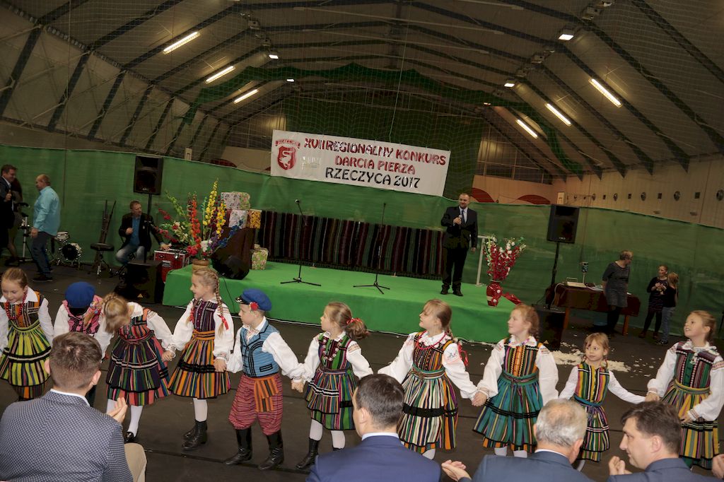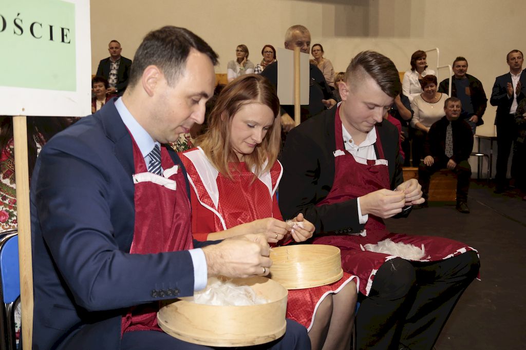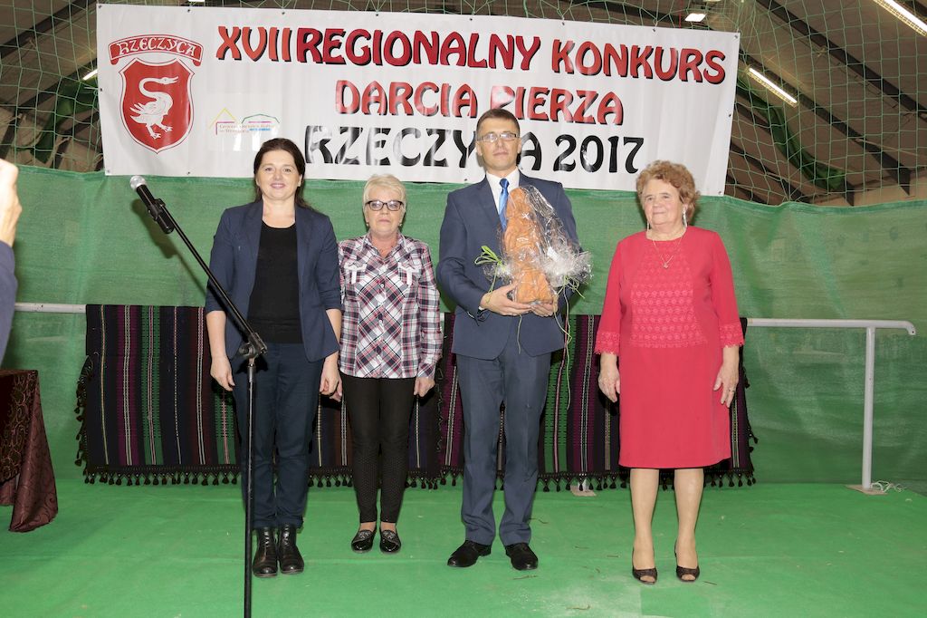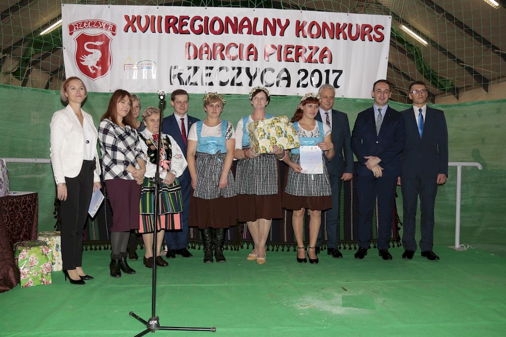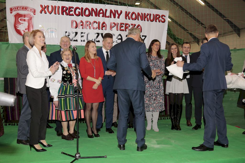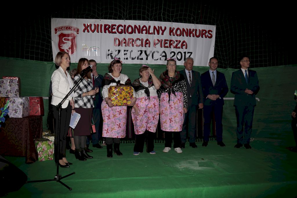 Tradycyjnie uczestników i gości naszej Pierzawki przywitała muzyka ludowa w wykonaniu Kapeli Gmajów. Konkurs otworzył oraz gości powitał Wójt Marek Kaźmierczyk. Komisję konkursową w składzie: Iwona Łuszcz Krawczyk Zastępca Wójta Gminy - Przewodnicząca, Bartłomiej Matysiak Członek Zarządu Powiatu Tomaszowskiego, Beata Ozga Flejszer Radna Sejmiku Województwa Łódzkiego, Marianna Pawlak twórczyni ludowa oraz Grażyna Kamińska z GOKu w Rzeczycy, przedstawił prowadzący imprezę, Dyrektor GOK-u Jacek Zakrzewski. Po ocenie jakości i wagi pierza zdartego podczas półtoragodzinnej rywalizacji, komisja najlepiej oceniła pracę reprezentacji Gminy Budziszewice i pierwsze miejsce przyznała drużynie Stowarzyszenia Kobiet Mierznianki z Mierzna. W konkursie rywalizowały drużyny: KGW z Nowin z gminy Bedków, KGW Wale z Gminy Czerniewice, KGW Brzustów z Gminy Inowłódz, KGW z Kochanowa z Gminy Lubochnia, KGW z Wąwału z Gminy Tomaszów Maz, KGW z Olszowej z Gminy Ujazd, KGW z Michałowa z Gminy Rokiciny, KGW z Bukowca z Gminy Żelechlinek, KGW z Wąglan z Gminy Białaczów, drużyna połączonych zespołów śpiewaczych: Bukowianki, Leśnianka oraz Stefanów z Gminy Brójce, KGW z Łęk Szlacheckich oraz KGW z Buczku z Gminy Poświętne. Gospodarzy- Gminę Rzeczyca reprezentowały Panie z KGW Glina Teresa Gmaj, Jadwiga Sobolewska oraz Bożena Dębicka. Po raz pierwszy Wójt Gminy Marek Kaźmierczyk zaprosił do darcia na specjalnie przygotowanym stanowisku gości naszej Pierzawki. Tej, okazuje się niełatwej sztuki próbowali miedzy innymi Marszałek Województwa Łódzkiego Dariusz Klimczak, starostowie, radni, wójtowie, przedstawiciele urzędów i zaprzyjaźnionych instytucji. Podczas darcia pierza widzowie mieli okazję zobaczyć występy Kapeli Gmajów, Kapeli Bobrowianie, Zespołu Ludowego Mali Rzeczycanie, Radosnej Grupy Folkowej Śliczny Zespół, posłuchać wywiadu z drużynami przeprowadzonego przez Kabaret Wcięci Przypadkiem oraz zobaczyć skecz w wykonaniu KGW z Wąglan. Tradycyjnie ze zdartego pierza wykonana zostanie poducha którą Wójt Gminy obdaruje pierwszego narodzonego w 2018 roku mieszkańca naszej gminy. Po wręczeniu nagród praz gospodarzy imprezy Starostę Mirosława Kuklińskiego oraz Wójta Marka Kaźmierczyka, Przewodniczącą Komisji Iwonę Łuszcz Krawczyk w towarzystwie Marszałka Dariusza Klimczaka, goście oraz mieszkańcy zostali zaproszeni na poczęstunek. Do późnych godzin nocnych uczestników bawił zespół Qattro z Inowłodza.