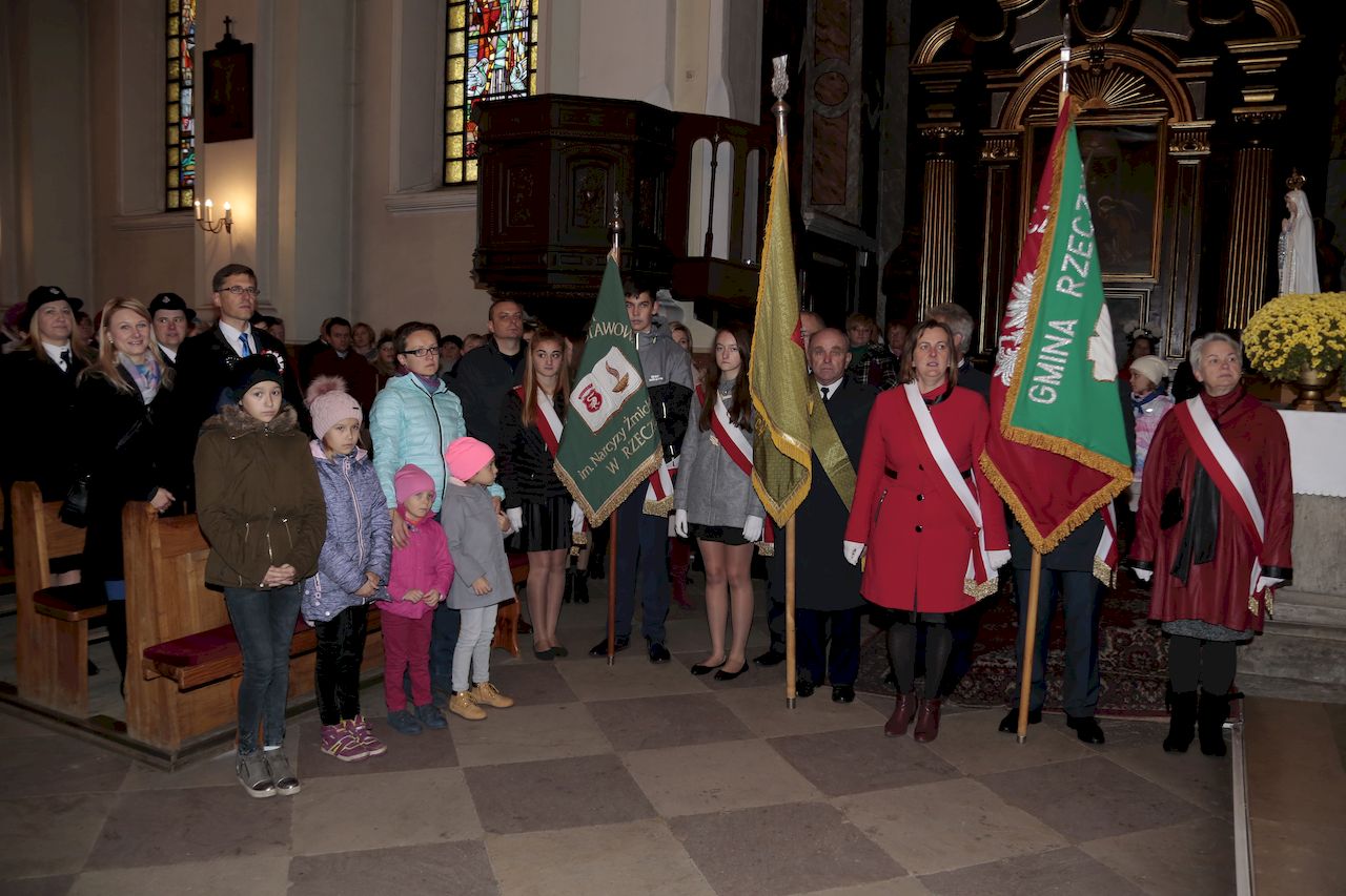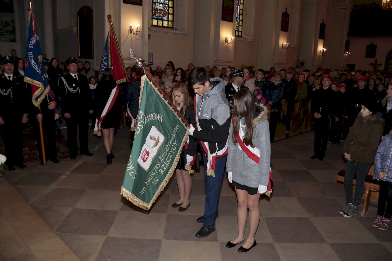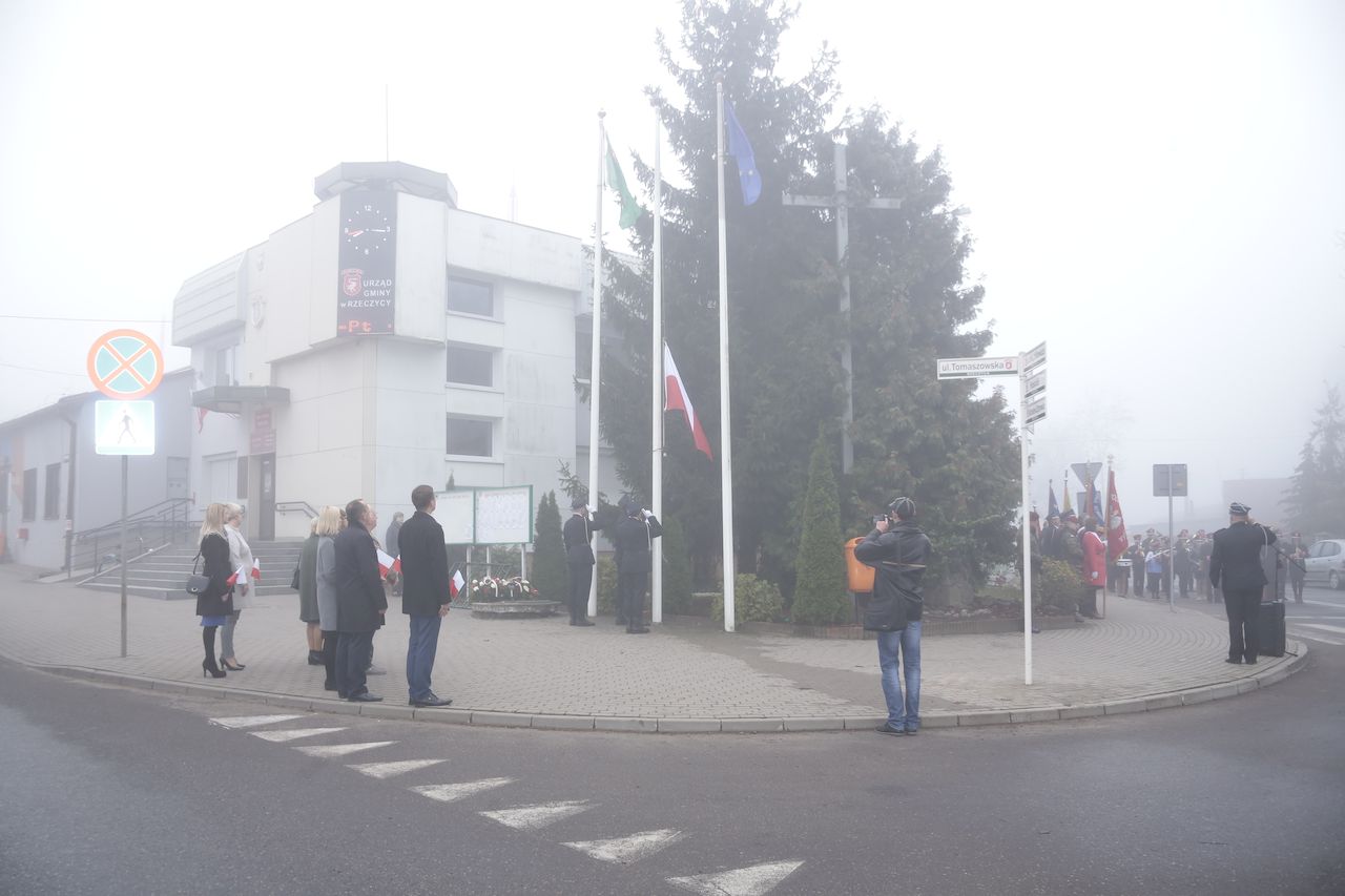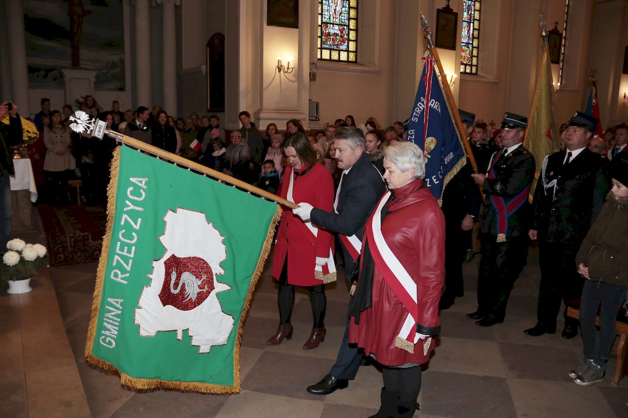 Uroczyste obchody rozpoczęły się w piątek 9 listopada we wszystkich placówkach oświatowych na terenie gminy. Akademie przygotowane prze uczniów oraz nauczycieli poszczególnych placówek,: poprzedziły wspólne odśpiewanie czterech zwrotek hymnu narodowego w ramach ogólnopolskiej akcji Ministerstwa Edukacji „ Rekord dla Niepodległej". W uroczystościach udział wzięli: Wójt Gminy Rzeczyca Marek Kaźmierczyk, Przewodniczący Rady Gminy Pan Leszek Kosiacki, Zastępca Wójta Pani Iwona Łuszcz-Krawczyk, Dyrektorka Szkoły Podstawowej Pani Grażyna Kielan, Dyrektorka Gimnazjum Pani Małgorzata Szczur, Wicedyrektorka Pani Aneta Machnicka, Kierowniczki szkół filialnych Pani Bernadeta Grot i Pani Agata Ostalska, Dyrektor GOK Pan Jacek Zakrzewski. Uczniowie, przedszkolaki, nauczyciele, pracownicy administracji i obsługi, goście oraz licznie przybyli rodzice równo o godzinie 11:11 wraz z 5 mln uczniów z całego kraju zaśpiewali „Mazurka Dąbrowskiego". W dniu 11 listopada przy obelisku upamiętniającym zamordowanie 36 mieszkańców naszej Gminy podczas II Wojny Światowej, przy którym wartę honorową zaciągnęli żołnierze 7 Batalionu Kawalerii Powietrznej z Tomaszowa Mazowieckiego, przy dźwiękach hymnu państwowego, poczet flagowy OSP dokonał uroczystego podniesienia flagi państwowej. Po odśpiewaniu hymnu nastąpiło odczytanie Niepodległościowego Apelu Pamięci, Dla uczczenia poległych w walkach za Ojczyznę, kwiaty przy obelisku złożyły delegacje Urzędu Gminy oraz jednostek podległych, Zarządu Oddziału Gminnego ZOSP RP, Drużyny Harcerskiej Vici, Gromady Zuchowej, Klubu Aktywności Społecznej oraz gminnej organizacji Polskiego Stronnictwa Ludowego. Następnie delegacja młodych strażaków zapaliła znicz oraz odegrano sygnał ,,Śpij kolego". Na zakończenie tej części obchodów, Wójt Gminy Marek Kaźmierczyk wygłosił okolicznościowe przemówienie. Następnie udano się do kościoła parafialnego, gdzie ks Proboszcz Henryk Linarcik odprawił uroczystą Maszę Świętą w intencji Ojczyzny. Po Mszy Świętej Chór Parafialny pod przewodnictwem Zbigniewa Laskowskiego dał koncert pieśni patriotycznych. Występ został bardzo gorąco przyjęty przez publiczność, a artyści otrzymali owację na stojąco. Po koncercie na uczestników uroczystości czekała gorąca grochówka przygotowana przez Panie z Koła Gospodyń Wiejskich Kierzanki z Sadykierza. Żołnierze z 7 Batalionu Kawalerii Powietrznej prezentowali podstawowe uzbrojenie i wyposażenie wojskowe. Wójt Gminy Rzeczyca składa serdeczne podziękowania wszystkim za udział w tym ważnym dla każdego Polaka Święcie.