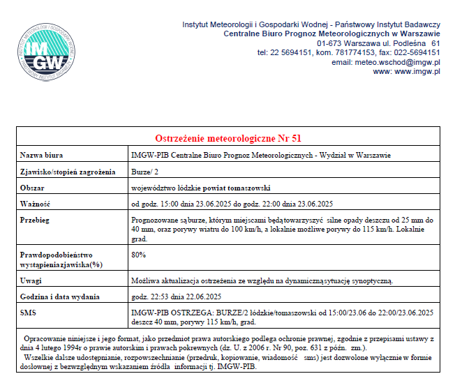 | Ostrzeżenie meteorologiczne na 23 czerwca |
