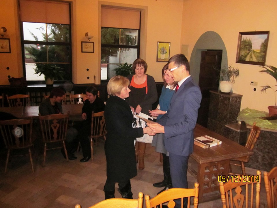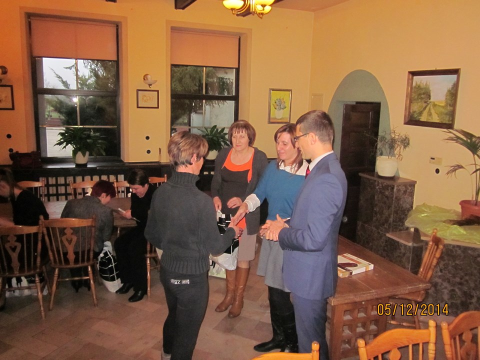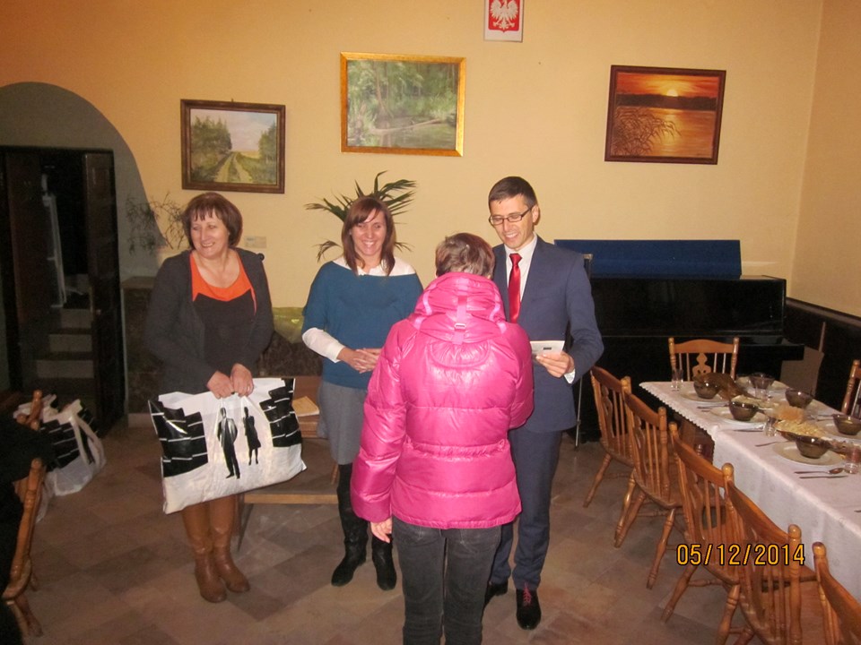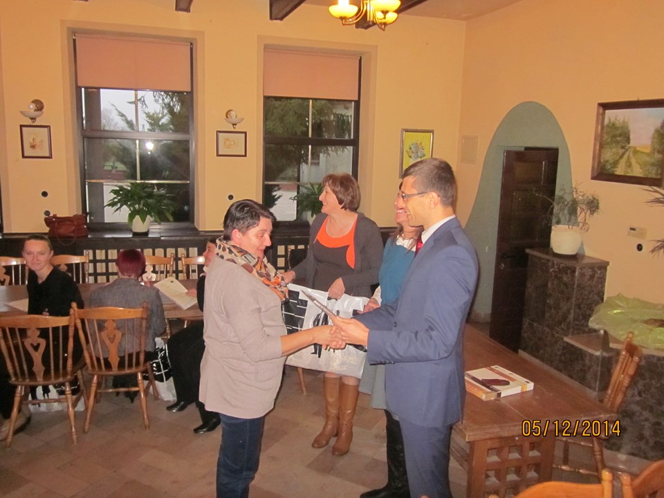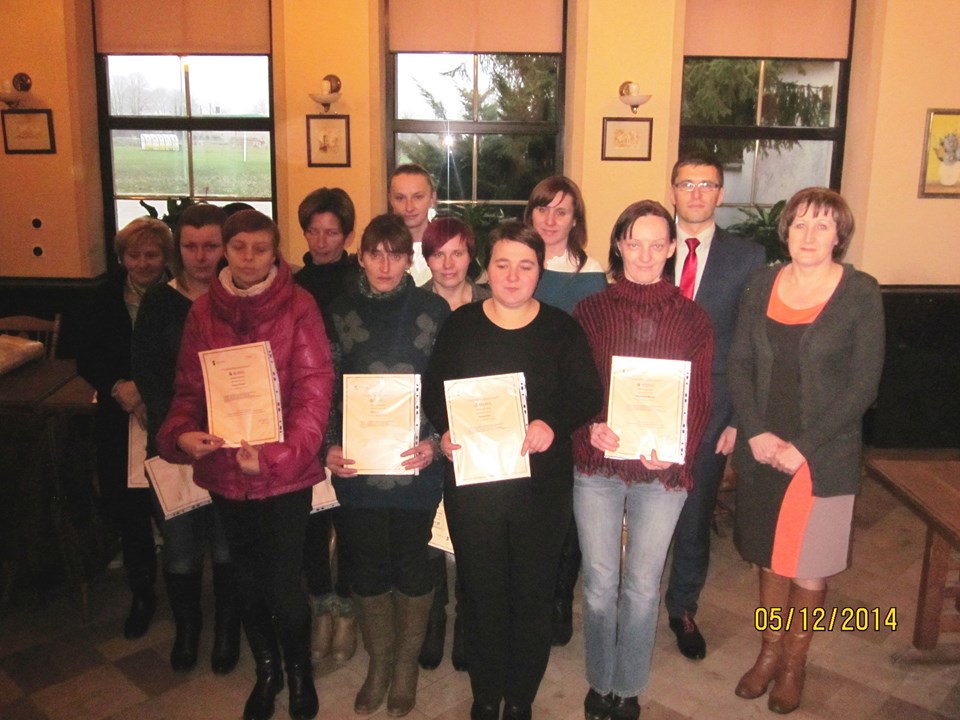 Wszystkich uczestników spotkania powitała Regina Sarwa – Kierownik GOPS w Rzeczycy – koordynator projektu, która podziękowała uczestnikom za udział w projekcie, za zaangażowanie i wytrwałość. Następnie głos zabrał Wójt Gminy Rzeczyca Marek Kaźmierczyk, który podkreślił, że uczestnictwo w projektach miękkich to nie tylko podniesienie kwalifikacji zawodowych uczestników ale także zmotywowanie do aktywnego poszukiwania pracy, zwiększenie pewność siebie, przygotowanie do zaprezentowania się podczas rozmowy kwalifikacyjnej z przyszłym pracodawcą. Ponadto zaznaczył, iż osiągnięte przez beneficjentów korzyści stanowią podstawę do zmiany swojej drogi zawodowej oraz szansę na wykorzystanie nowych kwalifikacji. „Program aktywizacji społeczno-zawodowej w gminie Rzeczyca" w 2014 r. realizowany przez Gminny Ośrodek Pomocy Społecznej w Rzeczycy współfinansowanego był ze środków Unii Europejskiej w ramach Europejskiego Funduszu Społecznego. Projekt realizowany był od 01.01.2014 r. do 31.12.2014r. Wartość ogólna projektu – 87.100,00 zł, w tym wkład własny – 9.145,50 zł. Projekt skierowany był do osób bezrobotnych zarejestrowanych w Urzędzie Pracy, nieaktywnych zawodowo oraz zatrudnionych w rolnictwie, które jednocześnie korzystają ze świadczeń pomocy społecznej i są w wieku aktywności zawodowej. W projekcie udział wzięło 10 kobiet. Warunkiem uczestnictwa w projekcie było zawarcie kontraktu socjalnego z pracownikiem socjalnym. W ramach kontraktu realizowane było wsparcie z zakresu : działania o charakterze środowiskowym – to zorganizowany w miesiącu lipcu 2014r. piknik rodzinny pn. „Promocja zdrowia rodziny", świadczenia pieniężne w postaci zasiłków celowych, a szczególności instrumenty aktywnej integracji w tym : 1) aktywizacja społeczna : warsztaty kompetencji psychospołecznych – cel : wzmocnienie poczucia własnej wartości, asertywność, rozwiązywanie konfliktów, rozwijanie kompetencji komunikacyjnych; 2) aktywizacja zawodowa : warsztaty doradztwa zawodowego i indywidualne poradnictwo zawodowe, cel 1: wymagania współczesnego rynku pracy, aktywne metody poszukiwania zatrudnienia, dokumenty aplikacyjne, skuteczna autoprezentacja, dostosowanie szkolenia do lokalnego rynku pracy; 3) aktywizacja edukacyjna: szkolenie zawodowe – „fakturowanie z obsługą kas fiskalnych" – cel : zdobycie nowych kwalifikacji zawodowych; 4) aktywizacja zdrowotna : warsztaty grupowej terapii psychologicznej, psychospołecznej i rodzinnej cel : terapia grupowa w zakresie dysfunkcji rodziny związanej z uzależnieniem, współuzależnieniem, bezradnością w sprawach opiekuńczo-wychowawczych i prowadzenia gospodarstwa domowego. W trakcie spotkania beneficjentom projektu Pan Wójt Gminy Marek Kaźmierczyk oraz Pani Regina Sarwa Kierownik GOPS i przedstawiciel firmy szkoleniowej wręczyli stosowne zaświadczenia o ukończonych kursach i warsztatach, w których brali udział w okresie od kwietnia 2014r. do listopada 2014r. Dodatkowo każdy z beneficjentów w ramach działań o charakterze środowiskowym otrzymał upominek. Po części oficjalnej wszyscy uczestnicy w miłej atmosferze udali się na uroczysty obiad.